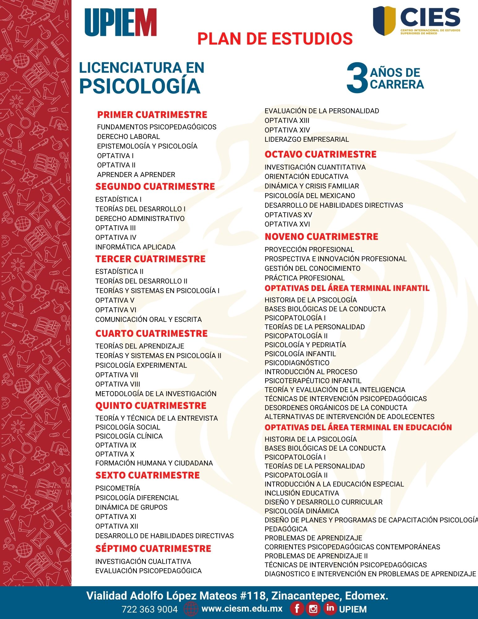 Estudia en una de las mejores universidades en Morelos, contamos con una oferta educativa amplia: estudia Especialidad en Psicología Clínica, Licenciatura en Ciencias de la Educación, Licenciatura en Contaduría Pública, Licenciatura en Derecho, Licenciatura en Mercadotecnia, Maestría en Ciencias de la Educación, Maestría en Terapia Familiar, Maestría en Derecho Penal, Maestría en Administración, Especialidad en Psicología Clínica, Maestría en Derecho, Licenciatura en Ciencias de la Educación, Licenciatura en Contaduría Pública, Licenciatura en Derecho, Licenciatura en Mercadotecnia, Licenciatura en Administración de Empresas Turísticas, Licenciatura en Psicología, Licenciatura en Gastronomía, Licenciatura en Administración de Empresas